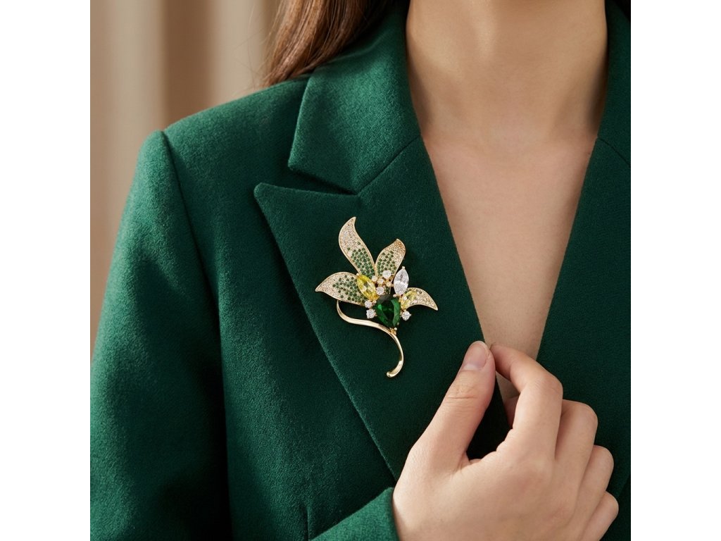 Brošňa Magnolia s brúsenými kryštálmi – zelená