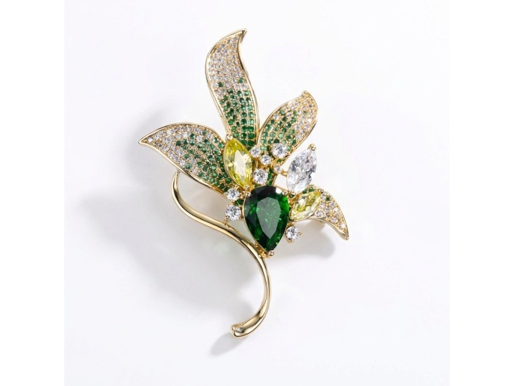 Brošňa Magnolia je navrhnutá tak, aby zachytila krehkosť a krásu jedného z najpôvabnejších jarných kvetov. Dizajnu dominuje centrálny kryštál v tvare kvapky v sýtej smaragdovo zelenej farbe, ktorý dopĺňajú ďalšie kamene v bruse „marquise“. Jednotlivé lupienky sú husto osadené drobnými čírymi a zelenými kryštálikmi, ktoré pri každom pohybe vytvárajú oslnivú hru svetla.