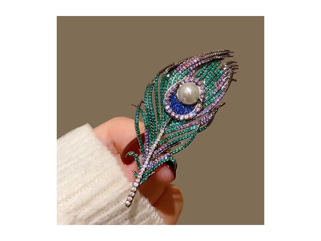 Brož ve tvaru pírka s barevnými krystaly a perlou
