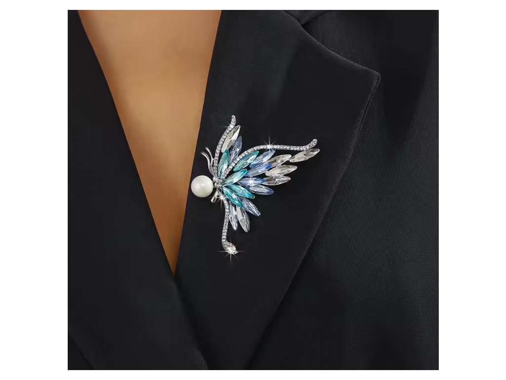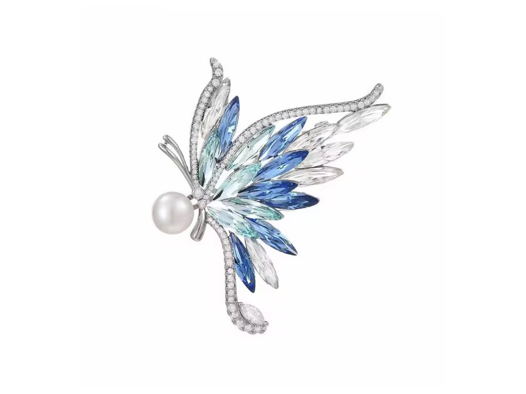 Tato postříbřená brož okouzlí propracovaným motivem letícího motýla, jehož křídla jsou tvořena oválnými krystaly v různých modrých odstínech. Obrys křídel je zdoben drobnými čirými krystaly, které zvýrazňují tvar a dodávají broži jemný třpyt. U těla motýla je umístěna bílá perla, která celému šperku propůjčuje elegantní, nadčasový a ženský charakter.
