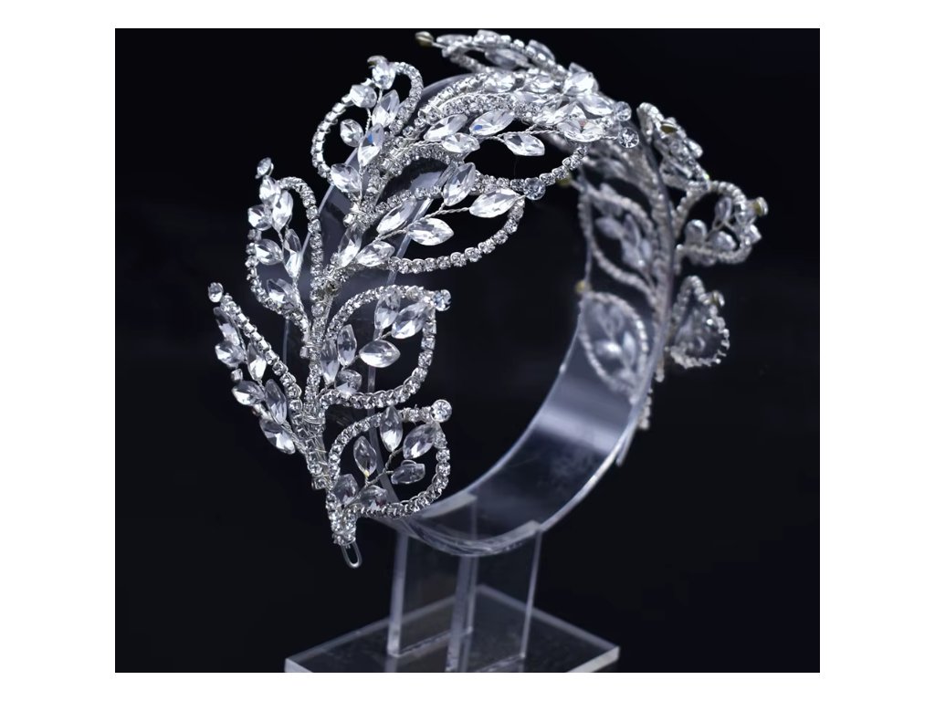 Luxusne pôsobiaca čelenka do vlasov v striebornej farbe je zdobená jemným motívom listov a osadená trblietavými kryštálmi, ktoré krásne odrážajú svetlo. Elegantný dizajn dodá účesu slávnostný nádych a podčiarkne ženskosť aj jemnosť celkového vzhľadu.