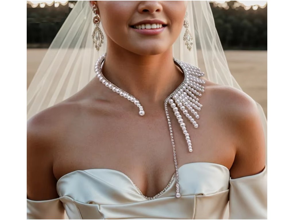 Tento výrazný asymetrický náhrdelník spája eleganciu perál a trblietanie kryštálov v modernom dizajne. Po vnútornom obvode sa tiahne jemná línia kryštálov, zatiaľ čo vonkajší obvod zdobia rady bielych perál, ktoré dodávajú šperku klasický pôvab. Z jednej strany náhrdelník prechádza do predĺžených strapcov, z ktorých posledný elegantne končí v dekolte a vytvára tak zvodný detail. Ideálna voľba na večerné alebo slávnostné príležitosti, keď chcete zažiariť originálnym a sofistikovaným doplnkom.