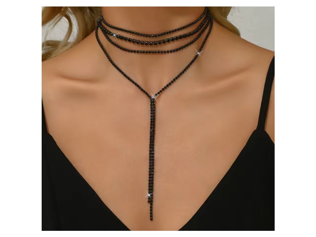 Tento moderní čtyřvrstvý choker náhrdelník zaujme svým vrstveným designem, který krásně zvýrazní dekolt. Černé krystaly dodávají šperku tajemný třpyt a luxusní vzhled, zatímco dva střapce přidávají pohyb a výrazný stylový akcent. Náhrdelník je ideální volbou pro večerní outfity i odvážné módní kombinace, které chtějí vyniknout.