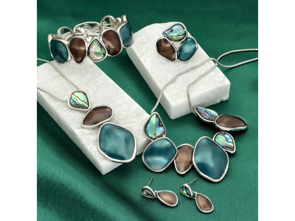 Náhrdelník ELEGANCE je postaven na čisté vertikální kompozici, která opticky prodlužuje siluetu a působí velmi lehce a elegantně. Kombinace tyrkysových, zelenomodrých a hnědých tónů vytváří klidný, vyvážený celek inspirovaný přírodou a mořskými hloubkami. Protáhlý tvar přívěsku vede pohled přirozeně dolů a jemně zvýrazňuje dekolt bez výrazné okázalosti.
