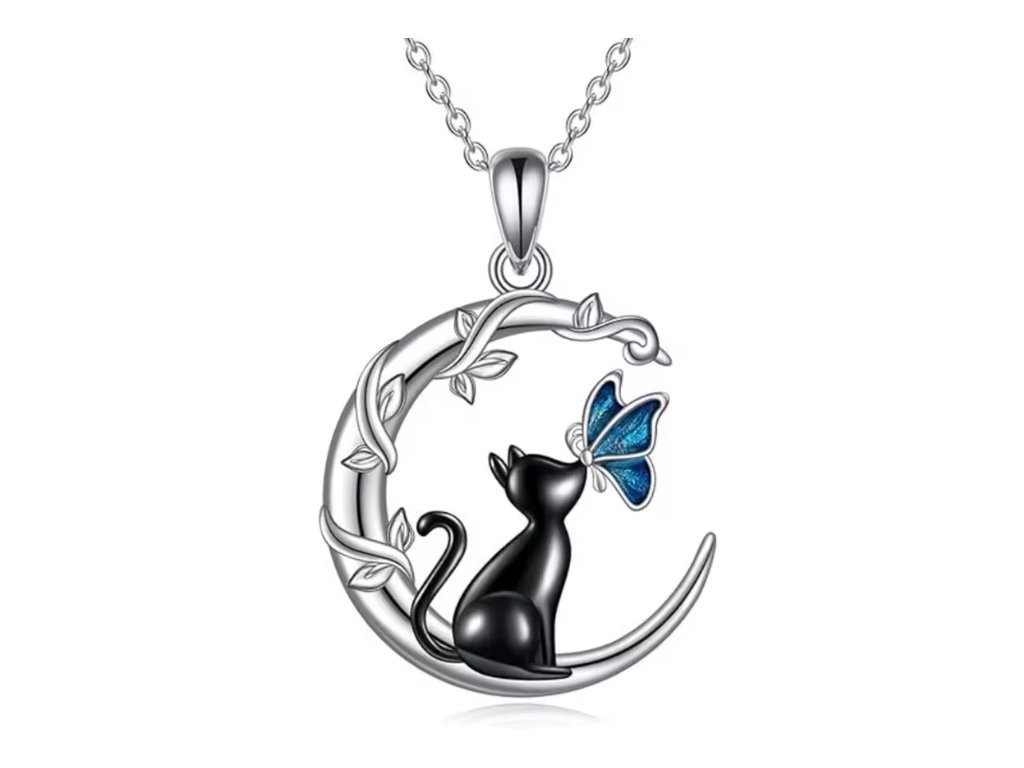 Tento postříbřený náhrdelník zaujme hravým a originálním designem. Přívěsek ve tvaru půlměsíce je doplněn roztomilou černou kočkou, která si hraje s jemným modrým motýlem. Náhrdelník je ideální doplněk pro milovníky koček a osobitý šperk, který podtrhne každý outfit.
