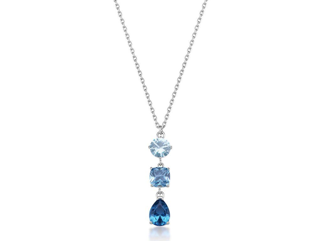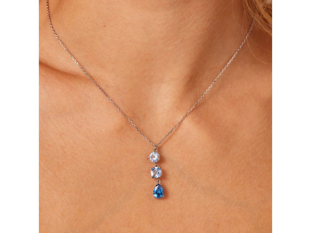Stredom pozornosti je nádherný prívesok tvorený tromi dokonale brúsenými kryštálmi v odtieňoch od svetlomodrej po tmavomodrú. Každý kryštál má iný tvar – okrúhly, štvorcový a kvapkovitý. Toto postupné vrstvenie vytvára harmonický, elegantný a výrazný efekt, ktorý upúta pri každom pohybe. Farebný prechod dodáva šperku hĺbku a sofistikovanosť.