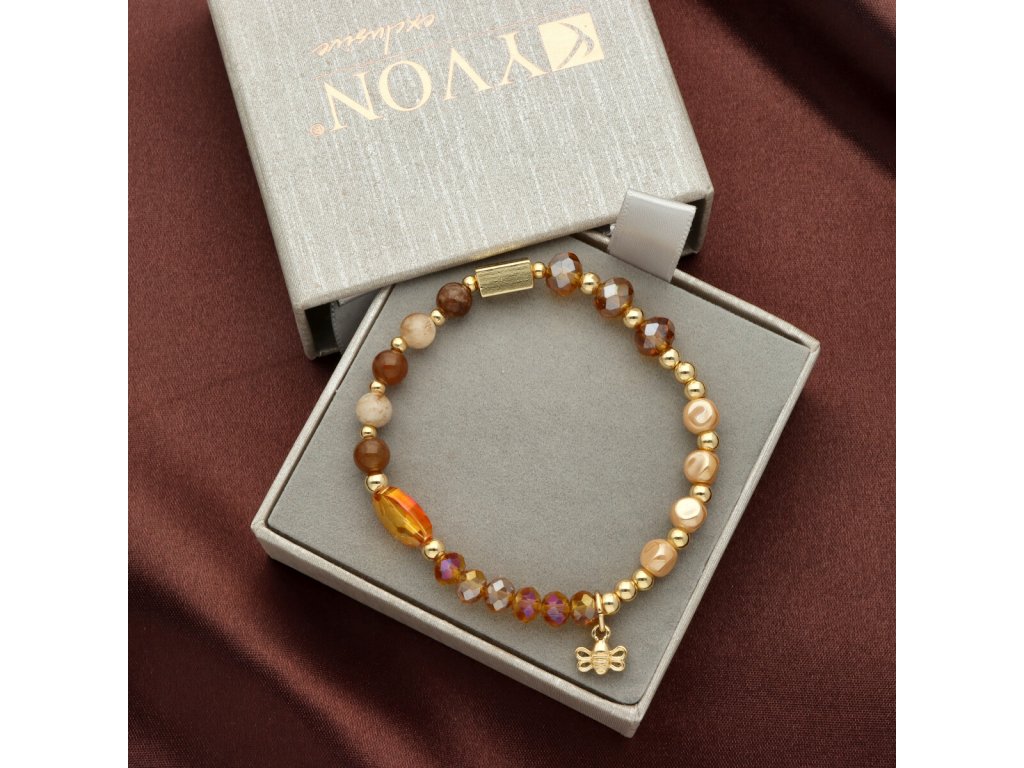 Náramok YVON pôsobí ako nežná hra svetla a teplých odtieňov, ktorú tvoria starostlivo vybrané korálky z krištáľu, fazetovaného skla a drobné kovové detaily. Jemné farebné prechody od medovo zlatých tónov až po mäkké béžové odtiene vytvárajú elegantný, prirodzene ženský dojem, zatiaľ čo malý prívesok motýlika dodáva náramku ľahkosť a radostný nádych.