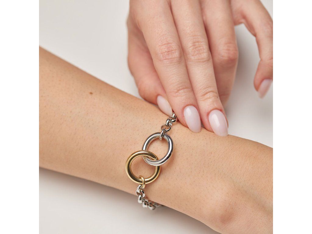 Dominantným prvkom náramku sú dva prepojené kruhy – symbol spojenia, harmónie a sily. Jeden z nich je opatrený luxusnou zlatou PVD úpravou, ktorá dodáva šperku jedinečný kontrast a eleganciu. Vďaka zapínaniu na oceľovú karabínu sa náramok nosí ľahko a pohodlne.