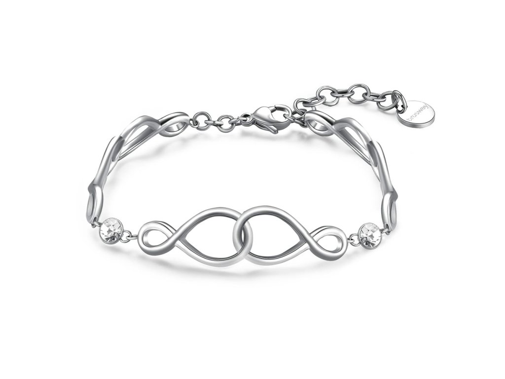 Dominantným prvkom šperku je prepojený symbol nekonečna, ktorý predstavuje večnosť, nekonečnú lásku a harmóniu. Tento motív je doplnený jemnými čírymi kryštálmi, ktoré dodávajú náramku jemný trblietavý efekt a sofistikovaný vzhľad.