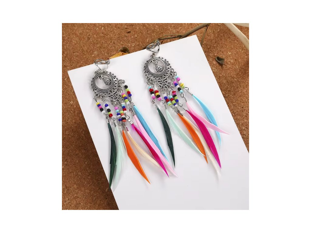 Tieto boho klipsové náušnice zaujmú živým a hravým dizajnom, ktorý kombinuje dlhé strapce s farebnými pierkami a drobnými korálkami. Tento mix vytvára jedinečný etnický look, ktorý dodá outfitu ľahkosť a bohémsky šarm.