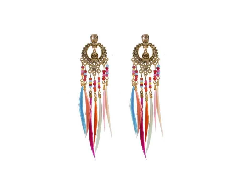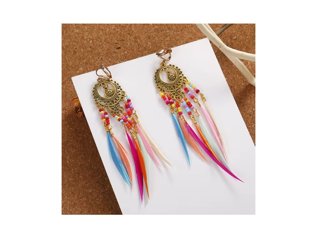 Boho klipsové náušnice so strapcami, farebnými pierkami a korálkami – zlaté / strieborné
