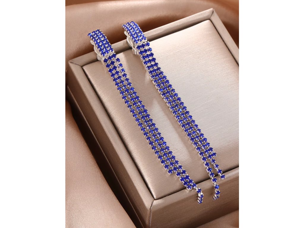 Tieto elegantné dlhé klipsové náušnice s modrými kryštálmi pôsobia noblesne a nadčasovo. Tri jemné strapce v striebornej farbe dodávajú náušniciam ľahkosť a pohyb, zatiaľ čo modré kryštály prinášajú elegantný farebný akcent s luxusným efektom.