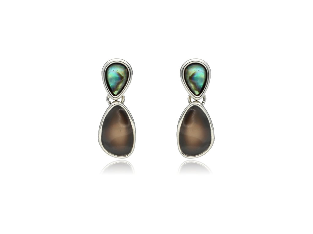 Náušnice ELEGANCE zaujmou hned na první pohled svou kontrastní kombinací barev a promyšleným vrstvením materiálů. Horní část zdobená přírodní mušlí abalone hraje zelenomodrými odlesky, které se mění podle světla, zatímco spodní kouřově hnědý prvek dodává šperku klid a vizuální hloubku. Celek působí vyváženě, moderně a velmi ženským dojmem.
