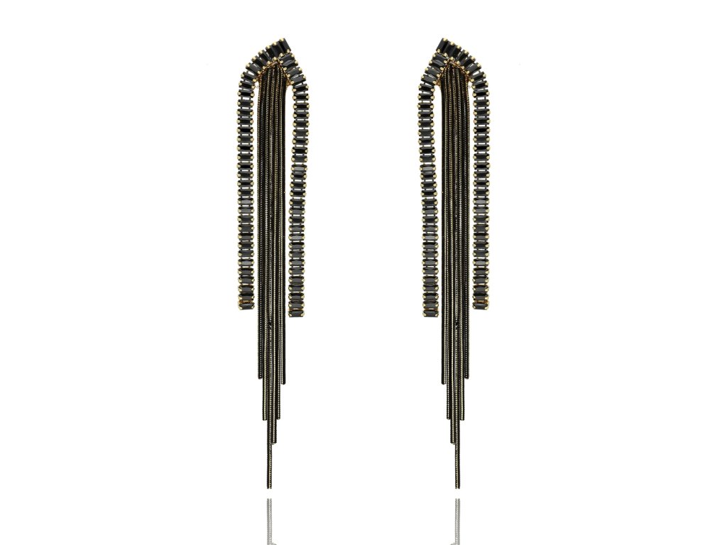 Náušnice jsou vyrobeny z antialergického kovu na bázi mosazi a osazeny kubickou zirkonií, která se vyznačuje vysokým leskem a čistými odlesky. Díky délce cca 9 cm krásně prodlužují linii krku a dodávají siluetě lehkost. Pečlivé zpracování a nízká hmotnost zajišťují pohodlné nošení během dne i při slavnostních příležitostech.