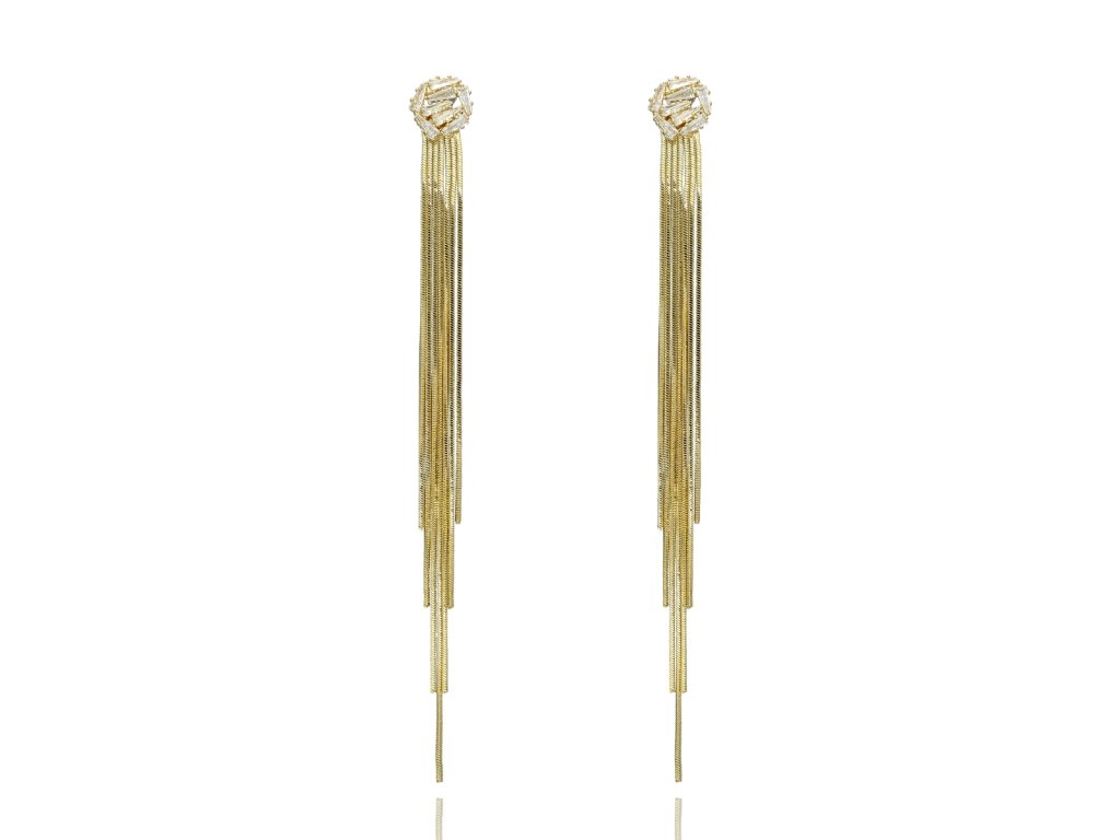 Náušnice jsou vyrobeny z antialergického kovu na bázi mosazi a osazeny kubickou zirkonií, která se vyznačuje čistými odlesky a jemným třpytem. Díky délce cca 10 cm opticky prodlužují krk a zvýrazňují linii ramen. Lehká konstrukce a pečlivé zpracování zajišťují pohodlné nošení po celý den i při slavnostních příležitostech.