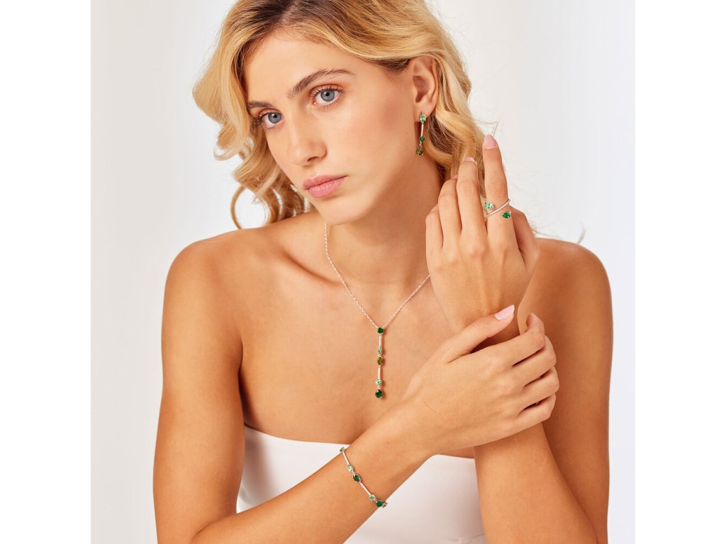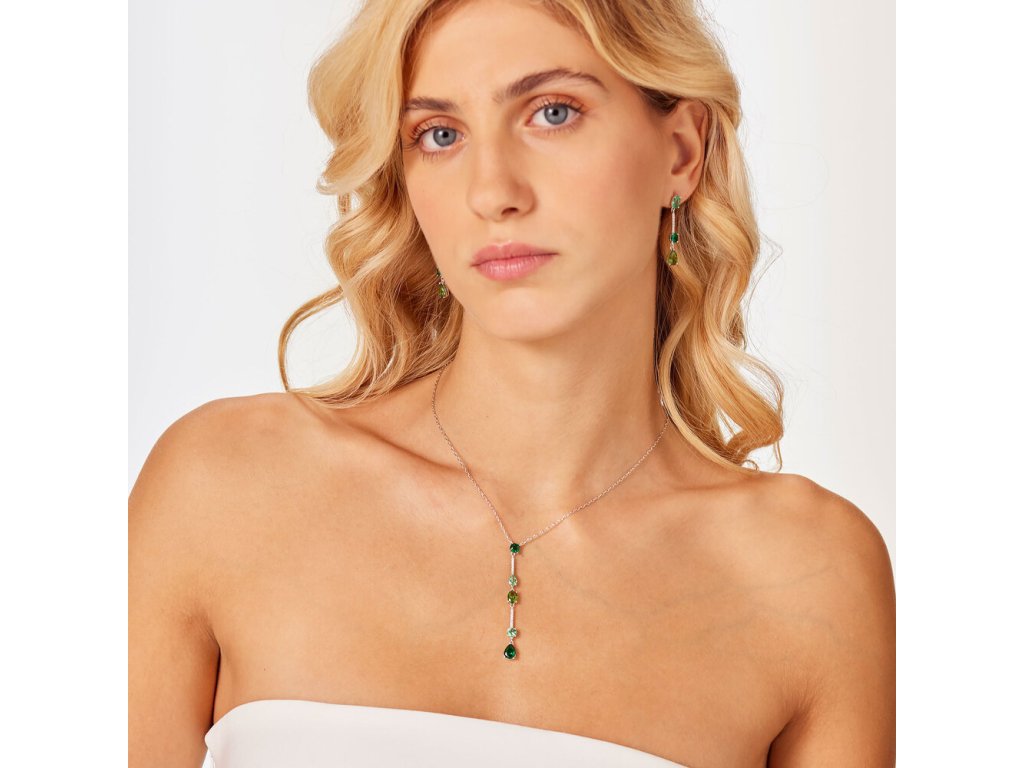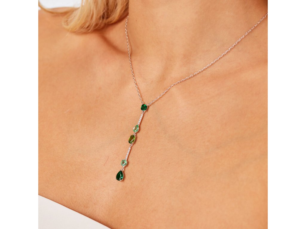 Náhrdelník Brosway Fancy Life Green zaujme svojou originálnou hrou svetla a odtieňov. Jeho vertikálny prívesok tvorí päť kubických zirkónov v rôznych zelených tónoch – od svetlých až po sýto smaragdové. Tento plynulý prechod farieb vytvára efekt hĺbky a pohybu, zatiaľ čo drobné číre kamienky medzi nimi dodávajú šperku jemný lesk a eleganciu. Retiazka zo striebra 925 dopĺňa dizajn svojou ľahkosťou a decentnosťou.