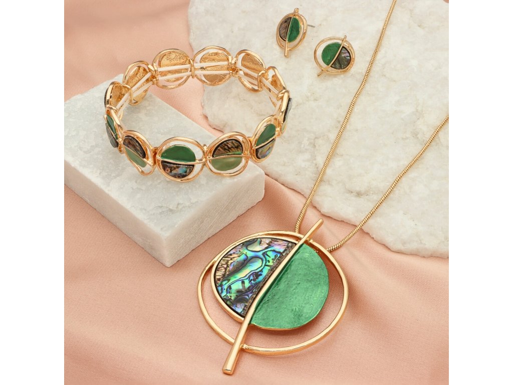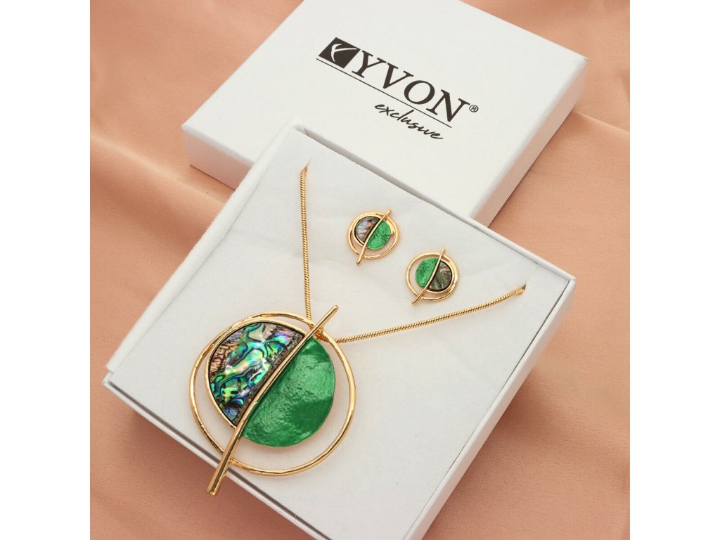 Tento šperkový set spája elegantný kruhový tvar so sílou farby a prírodných materiálov. Dominantný zelený prvok doplnený nepravidelným výsekom z mušle s dúhovými odleskami vytvára výrazný kontrast, ktorý pritom pôsobí veľmi harmonicky. Zlatý rám a línie dodávajú celému dizajnu jemnú štruktúru a štipku luxusu.