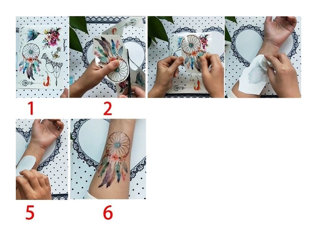 Tetovanie je možné ľahko aplikovať sami doma. Stačí odstrániť ochranný film, priložiť tetovanie na čistú a suchú pokožku a ľahko ho stlačiť. Potom použijete vlhkú handričku alebo hubku na namočenie tetovania, a po niekoľkých sekundách ju opatrne odstránite.