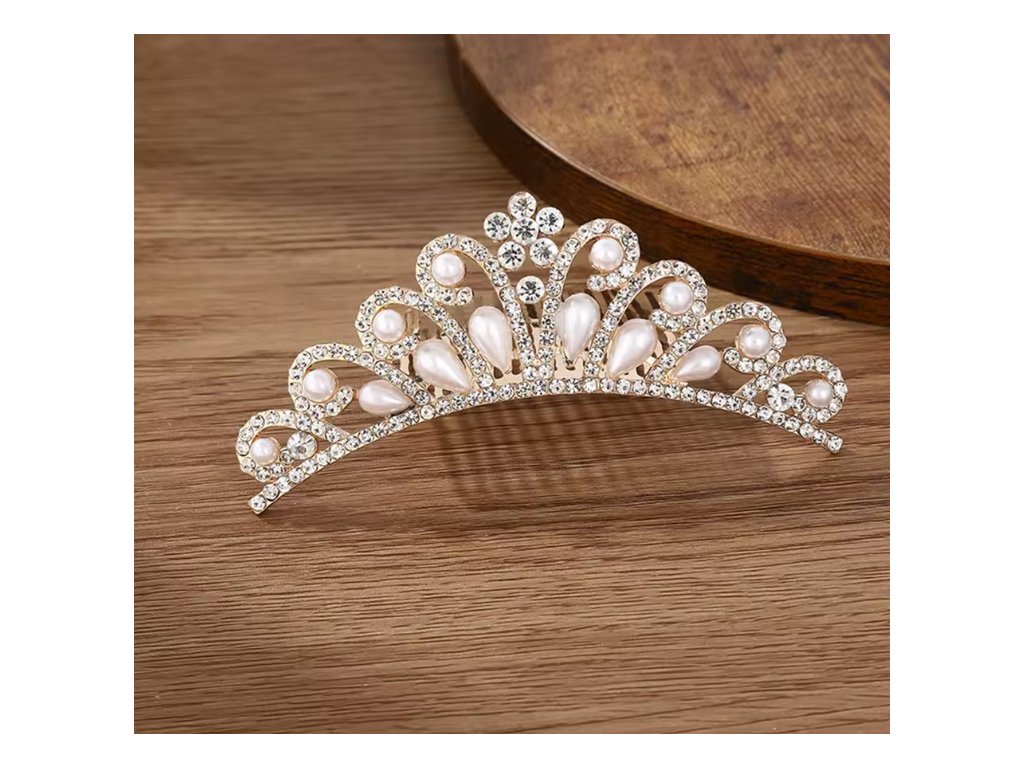 Pôvabný hrebeň do vlasov v tvare drobnej korunky dodá vášmu účesu kráľovský nádych. Základ v jemnom zlatoružovom odtieni pôsobí nežne a zároveň luxusne. Výrazným prvkom sú žiarivé kryštály, ktoré dopĺňajú biele perly – okrúhle aj slzovité – pre ešte výraznejší romantický efekt. Hrebeň sa ľahko zapína do vlasov a spoľahlivo drží aj v náročnejších účesoch. Perfektný doplnok pre nevesty, družičky, plesy alebo akúkoľvek slávnostnú udalosť, kde chcete zažiariť s noblesou.