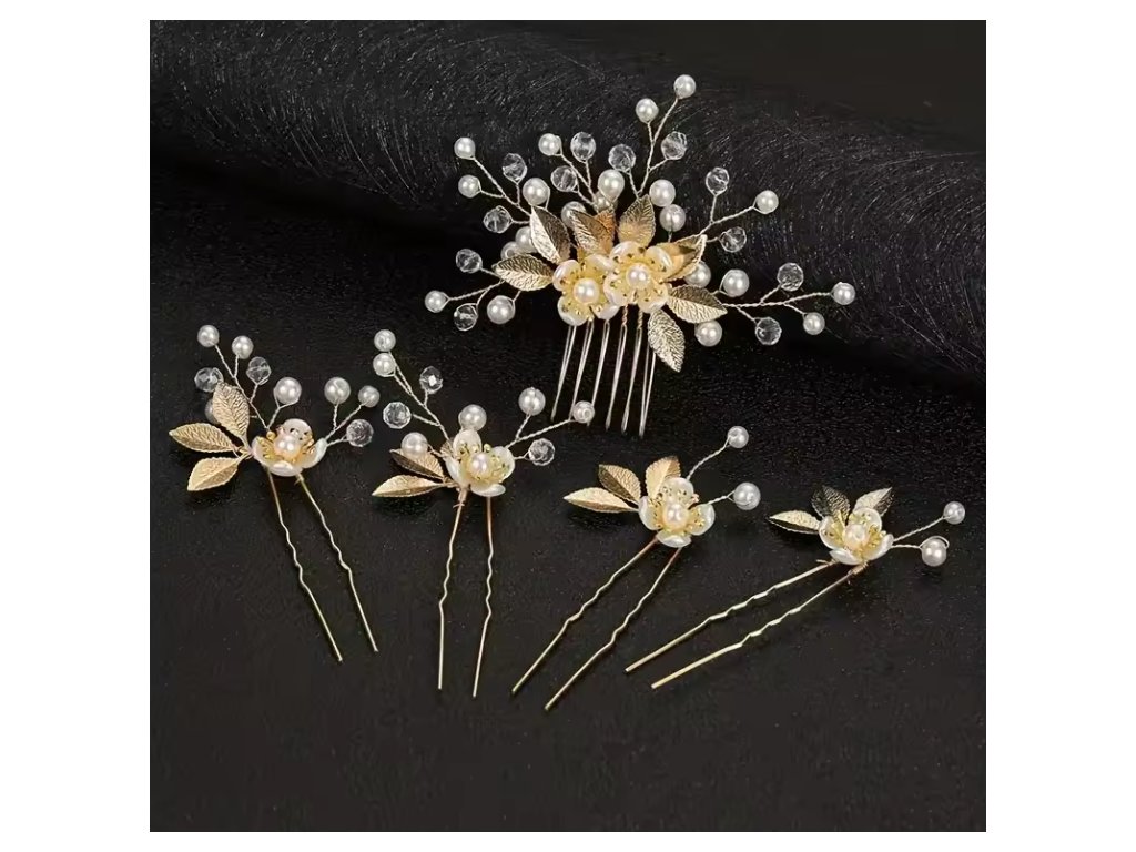 Tato romantická sada vlasových doplňků vyniká jemnými detaily a luxusním zlatým provedením. Každý kus je ozdoben drobnými perlami, třpytivými krystaly a květy doplněnými zlatými lístky, které vytvářejí dokonale sladěný celek. Ideální volba pro svatební nebo slavnostní účesy, kterým dodá nádech elegance a ženské něžnosti.