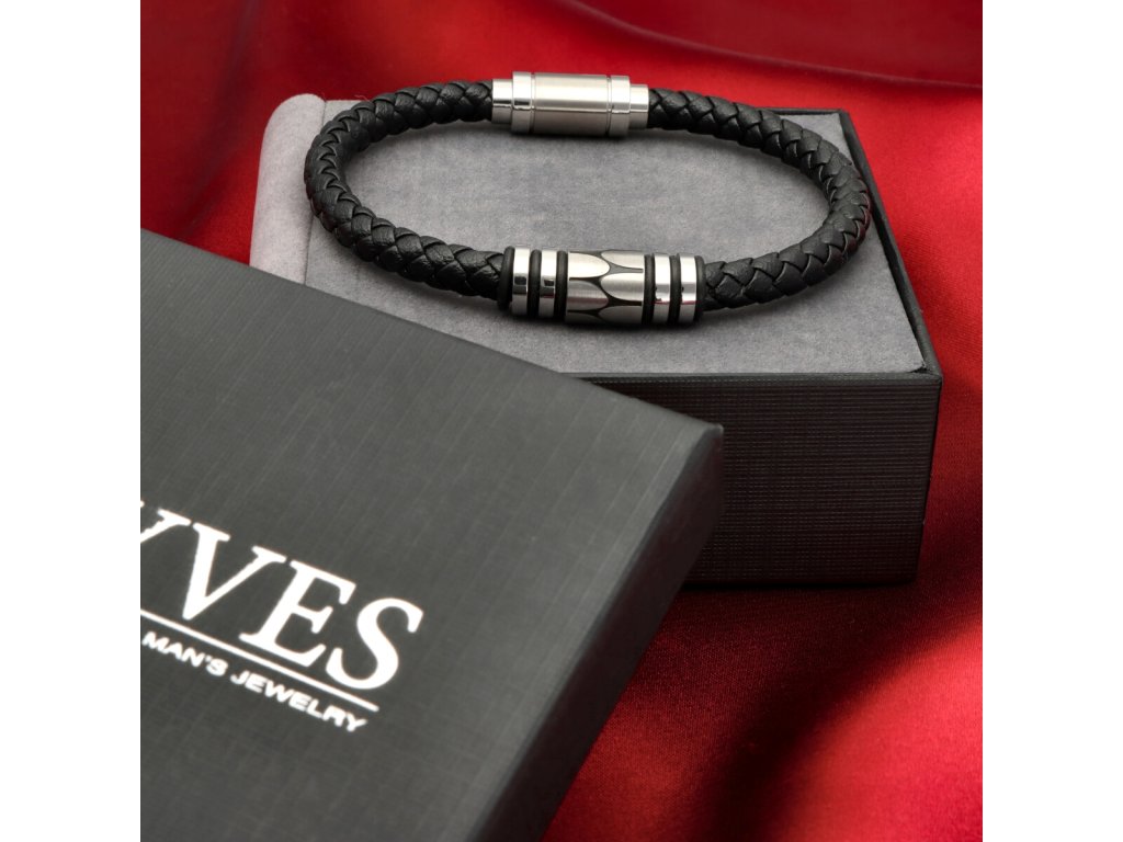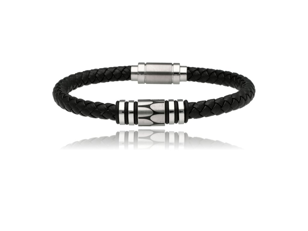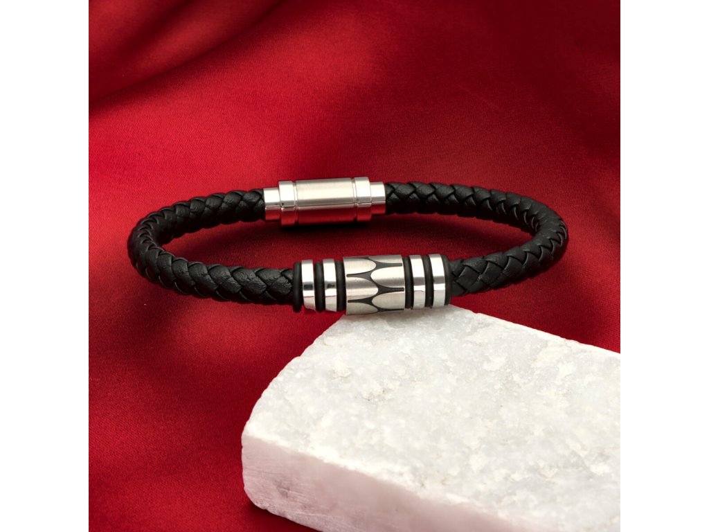 Pánsky náramok v kombinácii čiernej prírodnej kože a kovových detailov pôsobí sebavedomo, vyvážene a nadčasovo. Pletená štruktúra kože dodáva šperku charakter, zatiaľ čo stredový oceľový prvok s jemným vzorom vytvára vizuálne centrum, ktoré zaujme bez zbytočnej okázalosti.