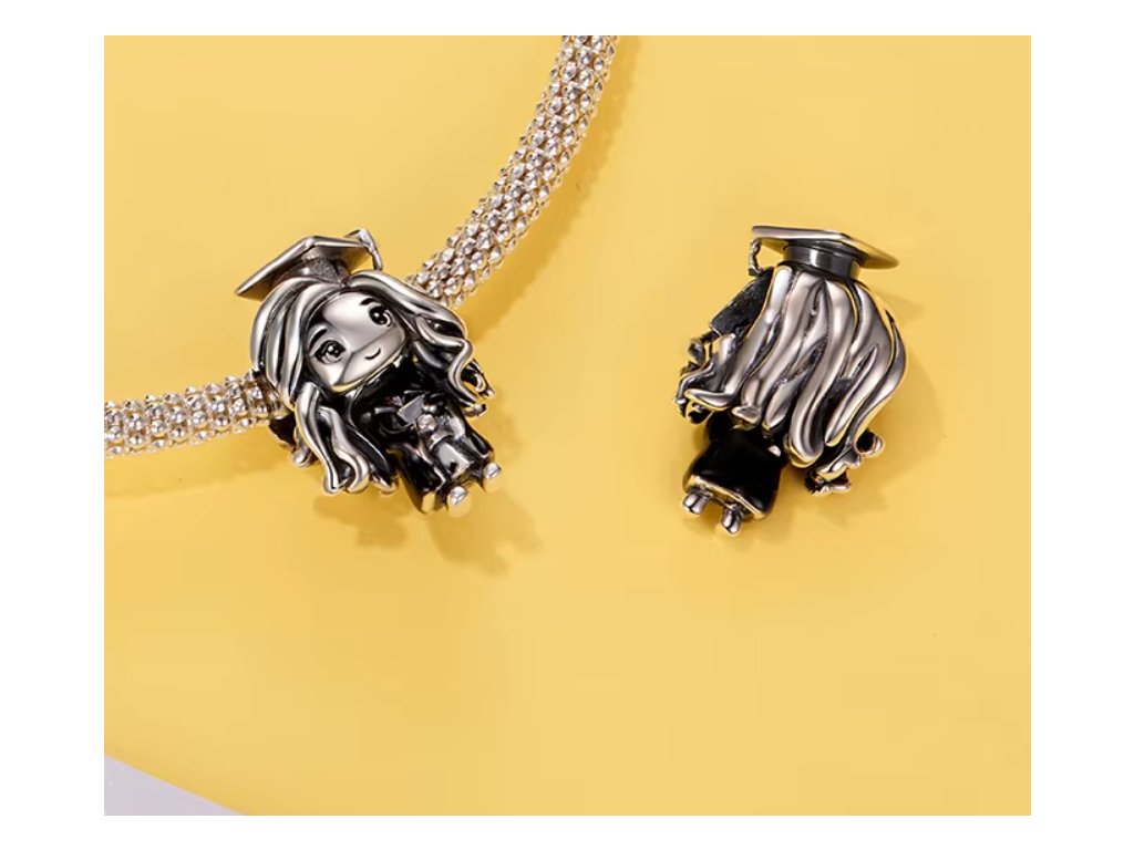 Tento detailně zpracovaný korálek ze stříbra 925 zobrazuje dívku–absolventku v černém promočním plášti s typickou promoční čepicí. Jemné detaily, jako jsou dlouhé vlasy a výraz siluety, dodávají šperku osobitý a slavnostní charakter. Korálek je krásným symbolem úspěchu a životního milníku a je ideálním dárkem k promoci či jako památka na důležitý okamžik.