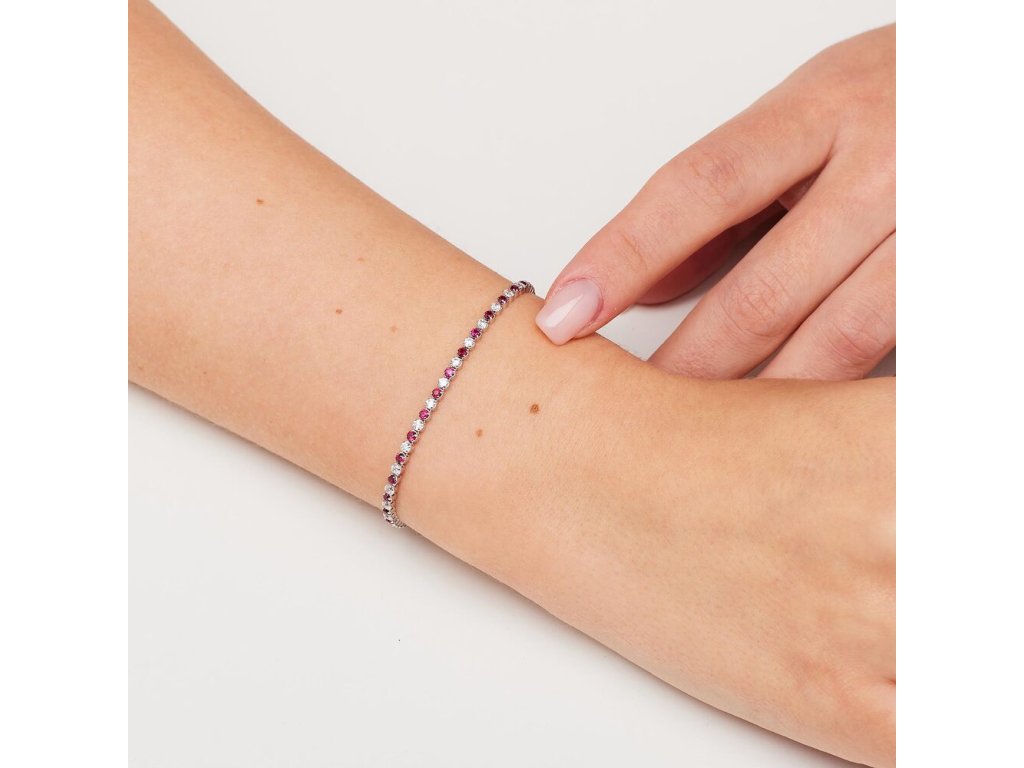 Náramok je osadený čírymi a červenými kubickými zirkónmi, precízne vsadenými do krapien, čo vytvára nádherný trblietavý efekt a jemný kontrast. Vďaka svojmu tenisovému štýlu pôsobí nadčasovo, elegantne a jednoducho sa kombinuje s inými šperkami. Pohodlné zapínanie na karabínku zaručuje bezpečné nosenie po celý deň.