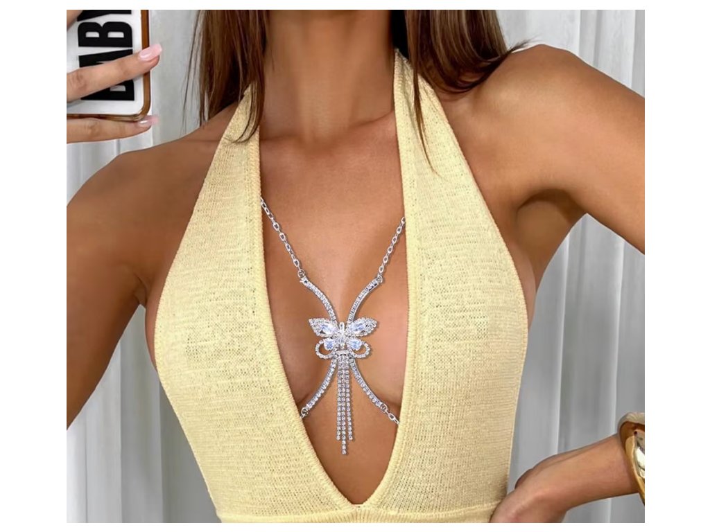 Luxusní řetízkový šperk na tělo (body chain) je navržen tak, aby zvýraznil dekolt a dodal outfitu výrazný, svůdný akcent. Dominantní motýlí motiv symbolizuje lehkost a ženskost, zatímco bohaté zdobení zirkony / rhinestones vytváří oslnivý třpyt při každém pohybu.
